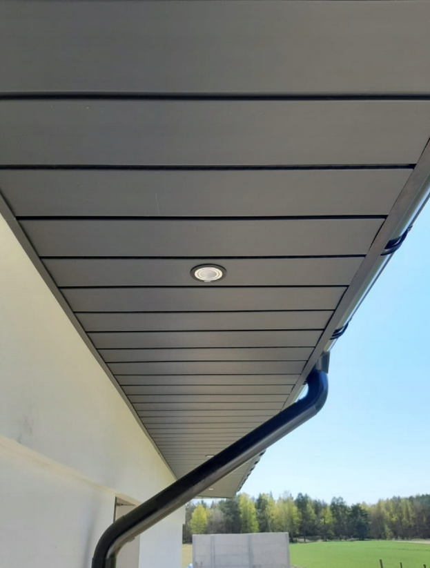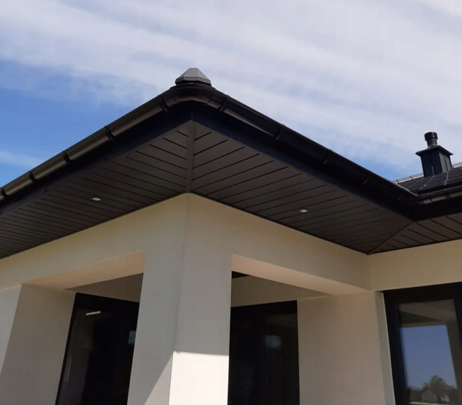 Listwy J-Trim służą do estetycznego zamknięcia krawędzi paneli. Łączniki natomiast umożliwiają precyzyjne połączenie kolejnych elementów podbitki, gwarantując spójny i schludny efekt końcowy. Całość tworzy harmonijną i funkcjonalną powierzchnię, odporną na działanie warunków atmosferycznych.